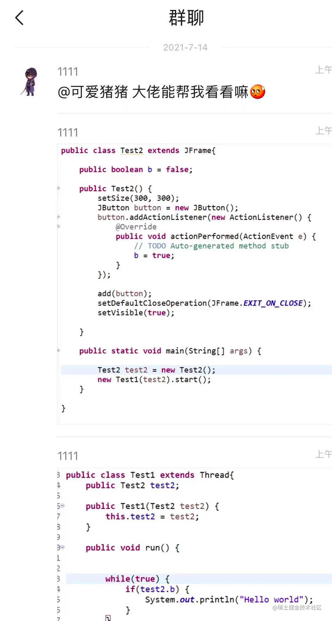 类Test1继承的是一个线程,该线程进行死循环,判断test2.b==true,则打印Hello world: