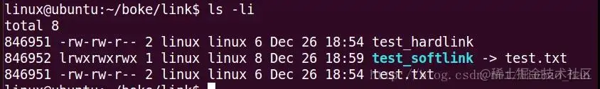 根据现象可以发现,test.txt文件的硬链接文件test_hardlink的inode号和原文件一样,而它的软链接文件tesrt_softlink的inode号就和原文件不一样,根据了解我们知道硬链接文件是原来文件的副本只是文件名不一样而已,软连接文件是一个新的文件(实际上硬链接文件在磁盘上和原文件使用的是同一个inode节点,软连接文件使用不同的inode节点来管理文件)。