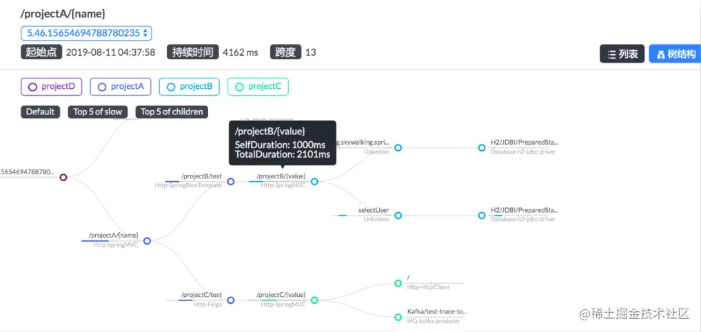 它很直观地显示了,在一个请求链路上,每个节点消耗的时间和请求的持续时间。