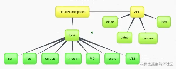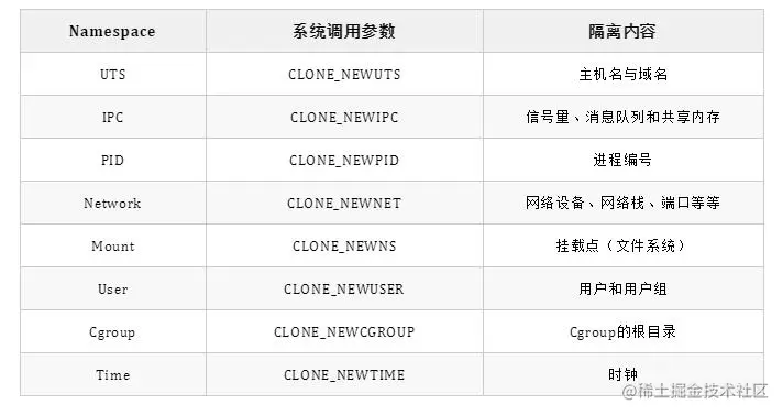 这里有个小细节,上面表格创建Mount Namespace的系统调用参数是CLONE_NEWNS,而不是CLONE_NEWMOUNT。从字面理解是创建一个命名空间的意思,这是由于历史原因导致的,因为Mount Namespace是第一个namespace,内核的开发者可能也没有预料到后续还有其它的namespace的加入,所以就先把CLONE_NEWNS给占用了。