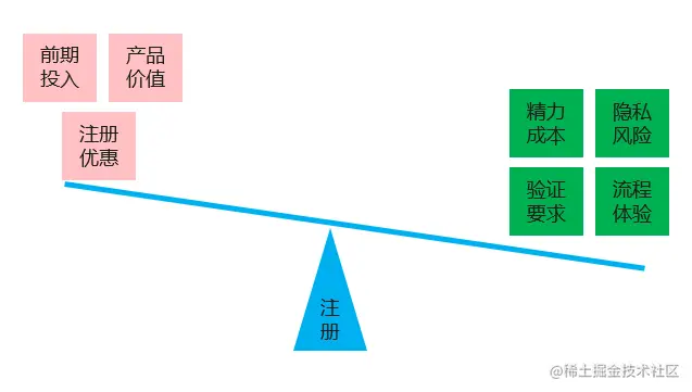 左侧是:产品功能提供的价值、前期投入的成本、注册之后获得的好处,右侧是:注册账号付出的精力成本、用户隐私泄露的风险、验证的复杂性、注册过程中的流程体验,当天平的右边压倒左边,用户就选择拒绝注册,而采用第三方登录可以有效提高用户登录转化率。