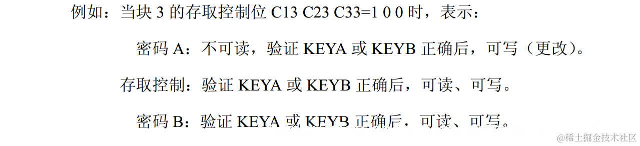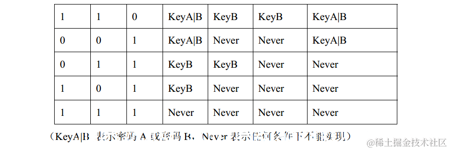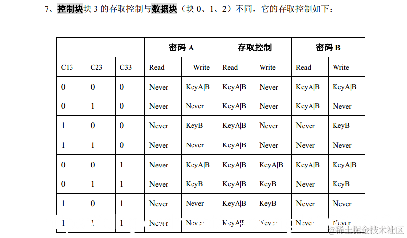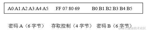 - 每个扇区的块3为控制块,包括了密码A、存储控制、密码B。具体结构如下: