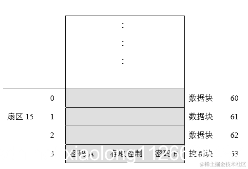 M1卡分为16个扇区,每个扇区由4块(0、1、2、3)组成。实际操作时,将16个扇区分为64个块,按绝对地址编号为0-63。