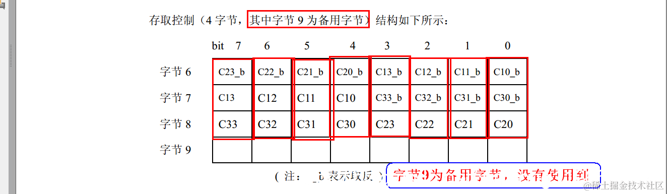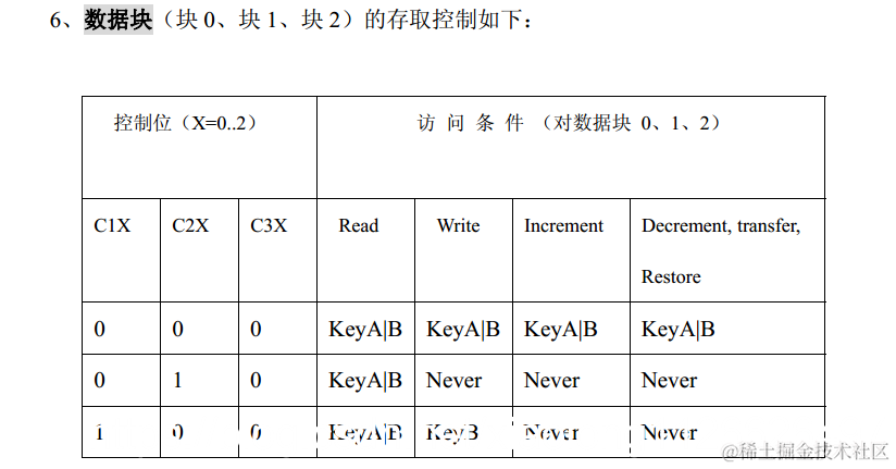 数据块的访问权限设置表格:(根据自己需要的权限,完成上图字节6、7、8的填充即可)
