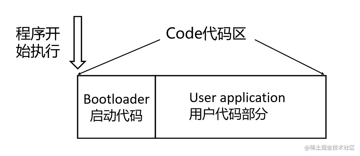 而IAP却能很好的解决掉这个难题,一片STM32芯片的Code(代码)区内一般只有一个用户程序。而IAP方案则是将代码区划分为两部分,两部分区域各存放一个程序,一个叫bootloader(引导加载程序),另一个较user application(用户应用程序)。bootloader在出厂时就固定下来了,在需要变更user application时只需要通过触发bootloader对userapplication的擦除和重新写入即可完成用户应用的更换。如图所示