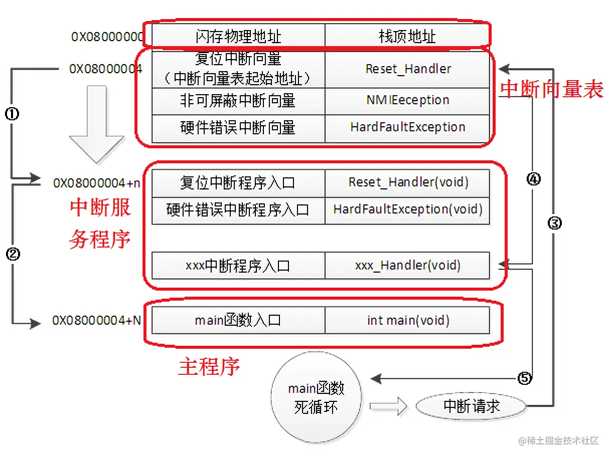 STM32F10x有一个中断向量表,这个中断向量表存放在代码开始部分的后4个字节处(即0x0800 0004),代码开始的4个字节存放的是堆栈栈顶的地址,当发生中断后程序通过查找该表得到相应的中断服务程序入口地址,然后再跳到相应的中断服务程序中执行。上电后从0x08000004处取出复位中断向量的地址,然后跳转到复位中断程序的入口(标号①所示),执行结束后跳转到main函数中(标号②所示)。在执行main函数的过程中发生中断,则STM32强制将PC指针指回中断向量表处(标号③所示),从中断向量表中找到相应的中断函数入口地址,跳转到相应的中断服务函数(标号④所示),执行完中断函数后再返回到main函数中来(标号⑤所示)。