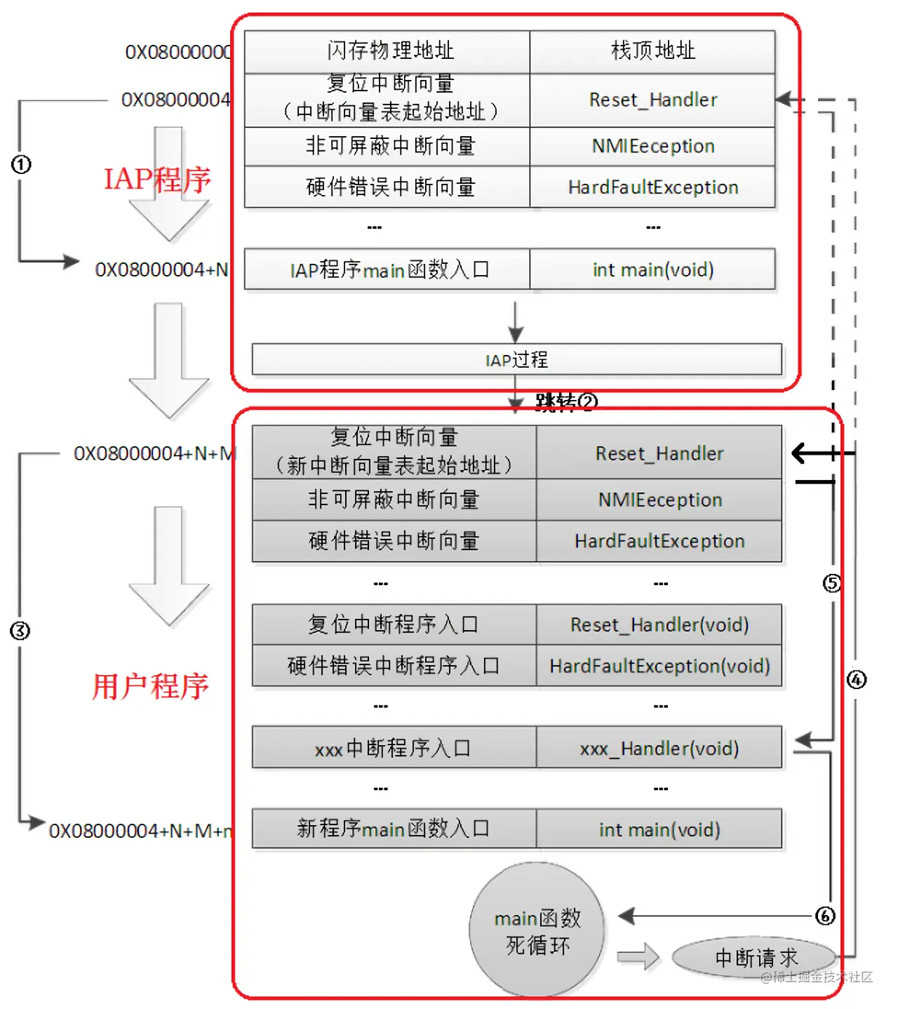上电初始程序依然从0x08000004处取出复位中断向量地址,执行复位中断函数后跳转到IAP的main(标号①所示),在IAP的main函数执行完成后强制跳转到0x08000004+N+M处(标号②所示),最后跳转到新的main函数中来(标号③所示),当发生中断请求后,程序跳转到新的中断向量表中取出新的中断函数入口地址,再跳转到新的中断服务函数中执行(标号④⑤所示),执行完中断函数后再返回到main函数中来(标号⑥所示)。