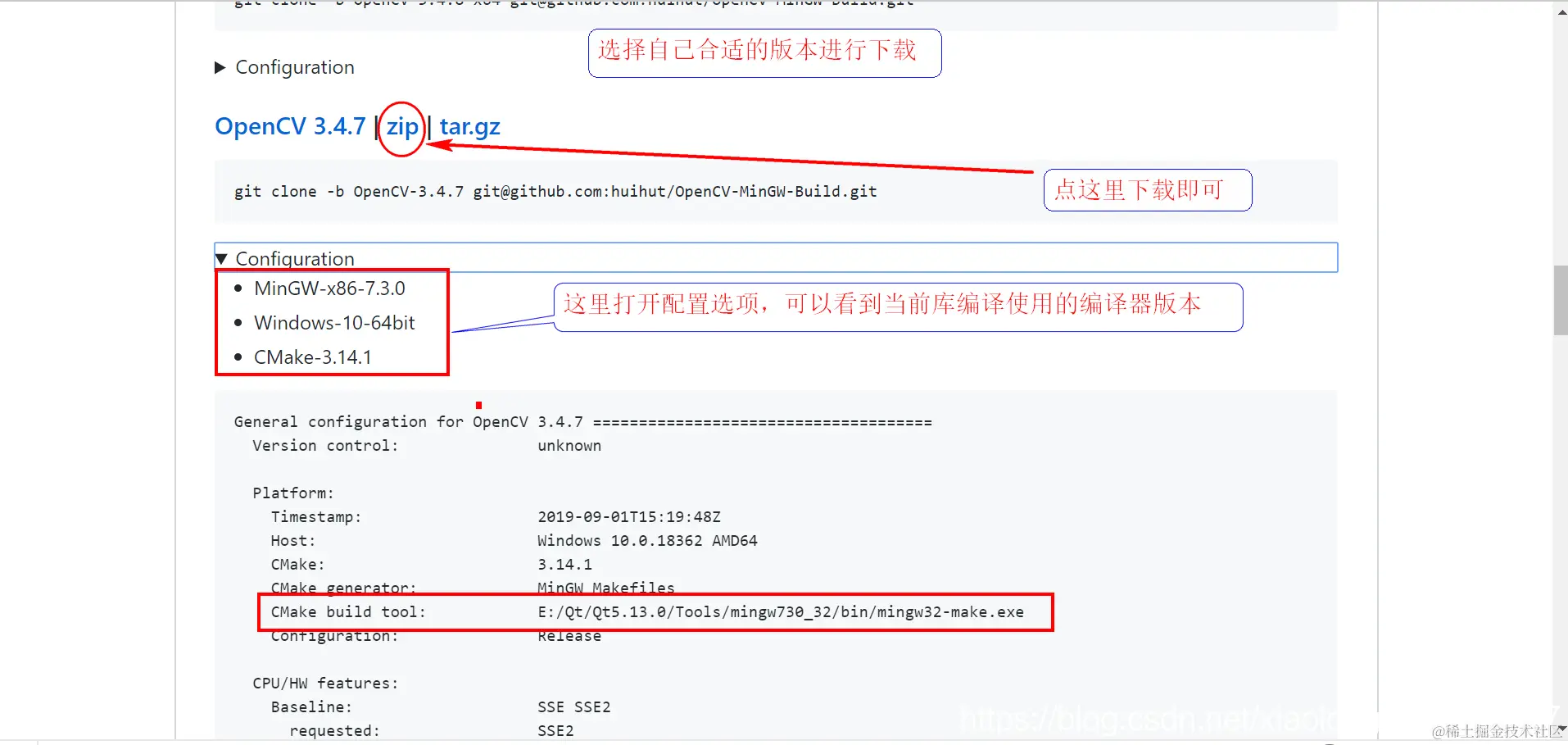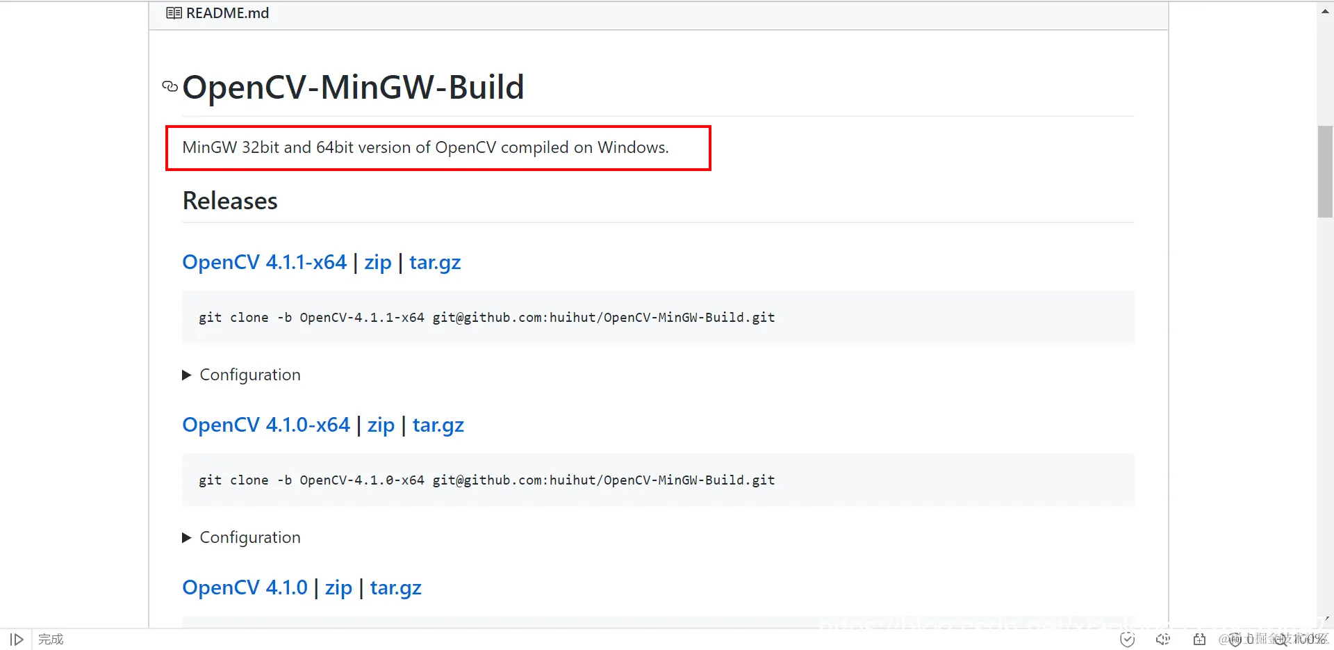 既然已经有编译好的MinGW库,就不用麻烦自己再去编译了,各种OpenCV对应的MinGW编译器编译的库下载地址: github.com/huihut/Open… 。