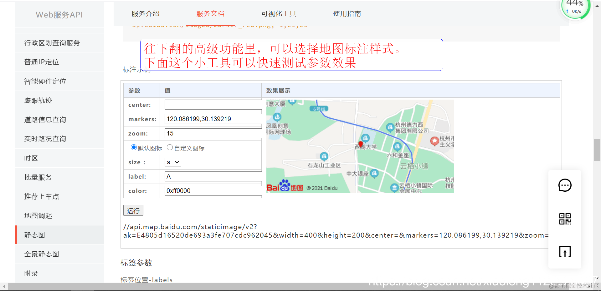QString url="http://api.map.baidu.com/staticimage/v2?ak=<这是你的KEY>&width=200&height=400¢er=&markers=120.086199,30.139219&zoom=15&markerS";
