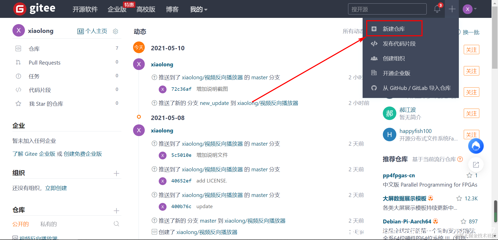 登录码云官网,注册账号,新建一个仓库。 ---当然也可以使用其他的Git服务器。 比如: GitHub、码云、腾讯工蜂、CSDN等。