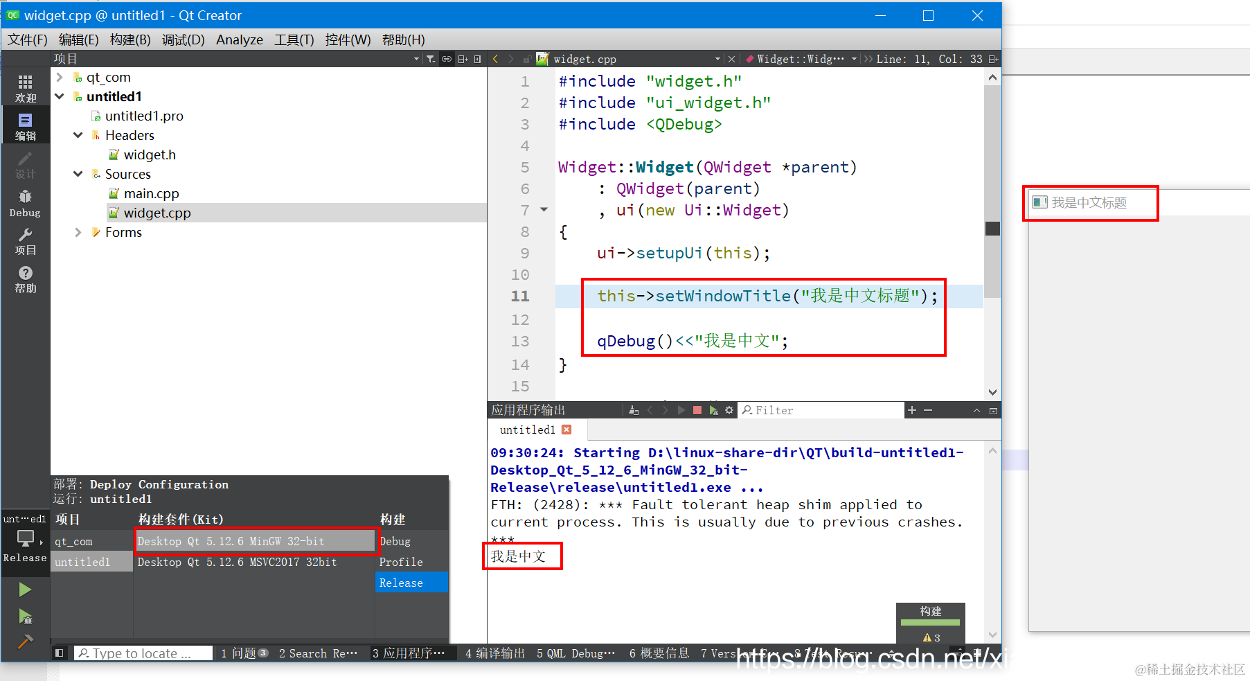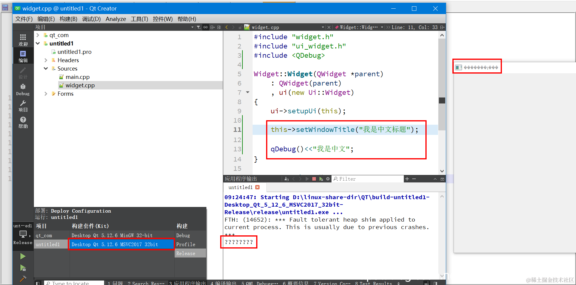 QT软件开发:QtCreator使用VS2017编译器中文乱码解决 DS小龙哥 2021-07-16 602 阅读1分钟 MinGW编译器中文显示正常: 使用VS2017编译器中文乱码: 解决办法: 在头文件里添加: #pragma execution_character_set("utf-8") 解决后,VS2017编译器编译运行效果: MinGw编译器编译运行效果: