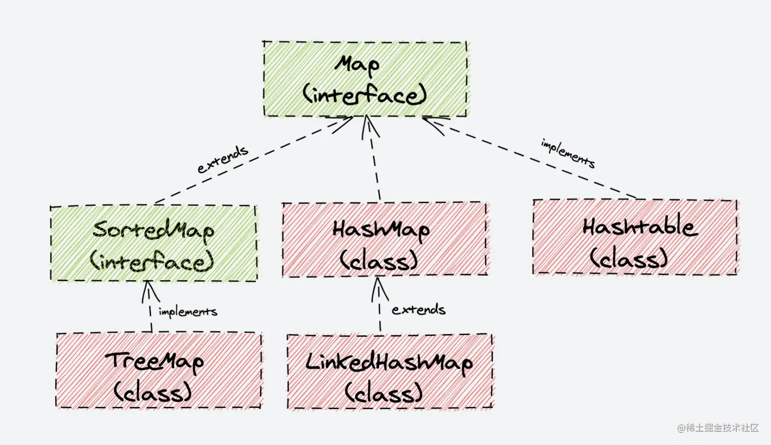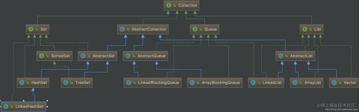 Collection 接口下又有三种子类型接口:List、Set、Queue,再下面是一些抽象类,最后是具体的实现类,常用的集合实现类有:ArrayList,LinkedList,HashSet,TreeSet,LinkedBlockingQueue,ArrayBlockingQueue 等。