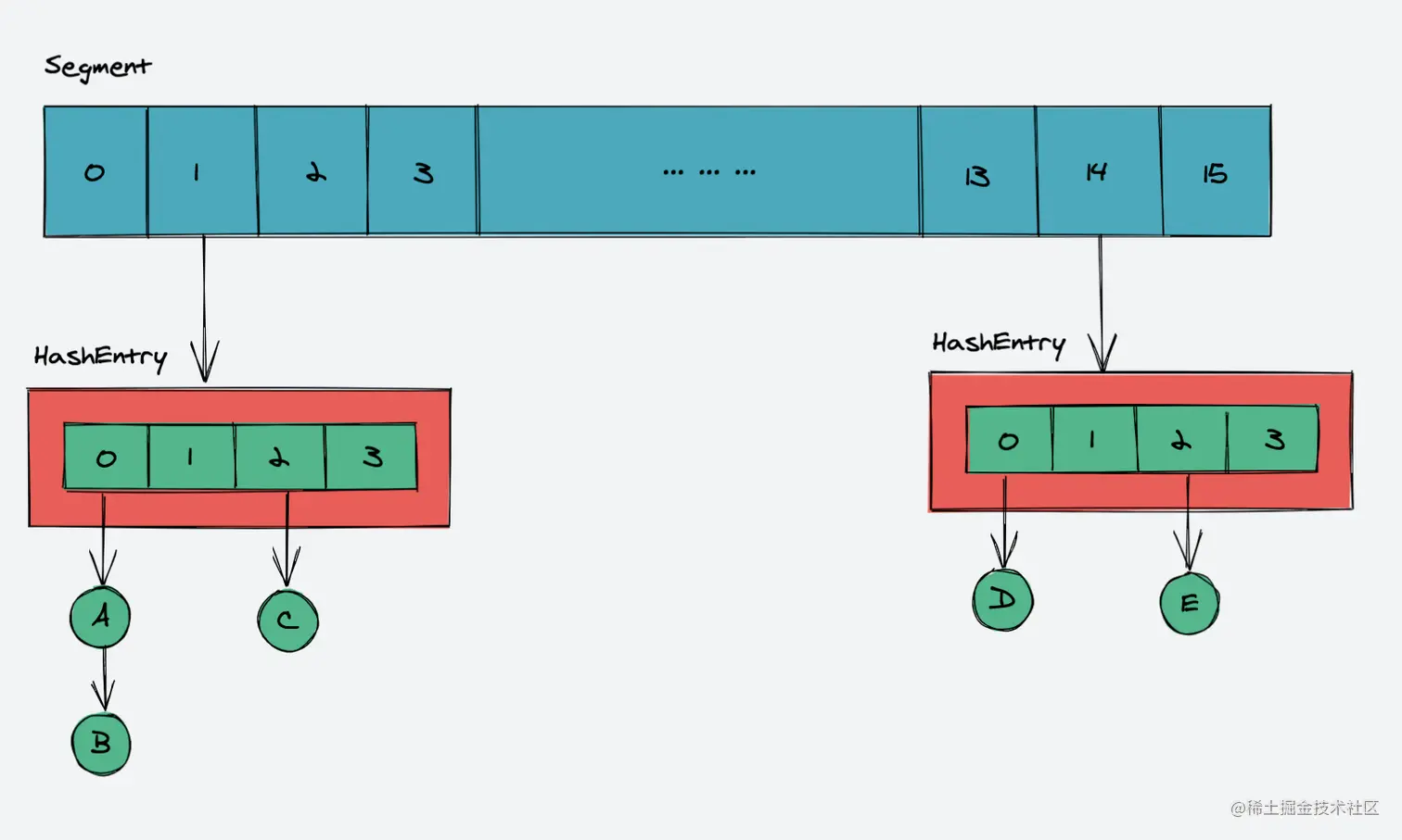 我们看到,ConcurrentHashMap 的结构示意图和 HashMap 的示意图差不太多。