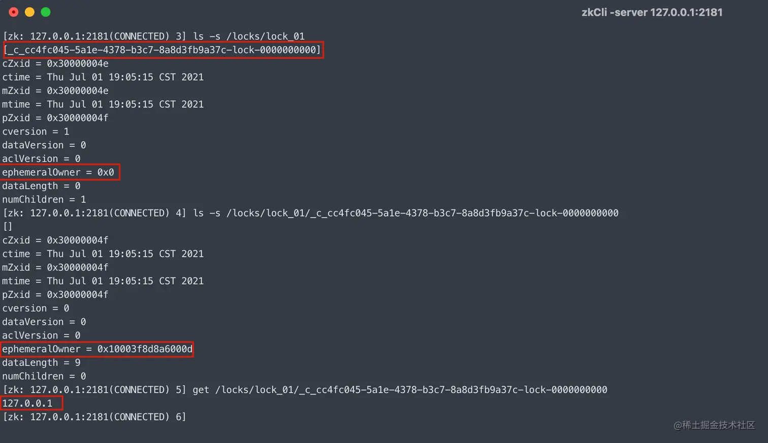 /locks/lock_01加锁,实际锁住的是/locks/lock_01/_c_UUID-lock-序号,举例为/locks/lock_01/_c_cc4fc045-5a1e-4378-b3c7-8a8d3fb9a37c-lock-0000000000
