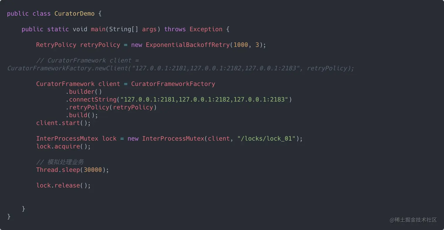 一般工作中常用的分布式锁,就是基于 Redis 和 ZooKeeper,前面已经介绍完了 Redisson 锁相关的源码,下面一起看看基于 ZooKeeper 的锁。也就是 Curator 这个框架。