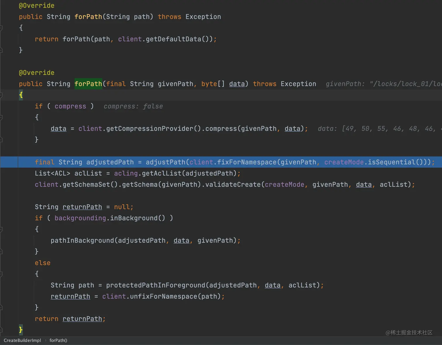 进入 CreateBuilderImpl#forPath(java.lang.String, byte[])