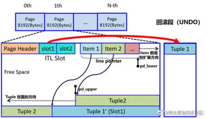 图 1:Ustore 数据存储示意图:数据在原 page 页,undo 通过指针单独管理