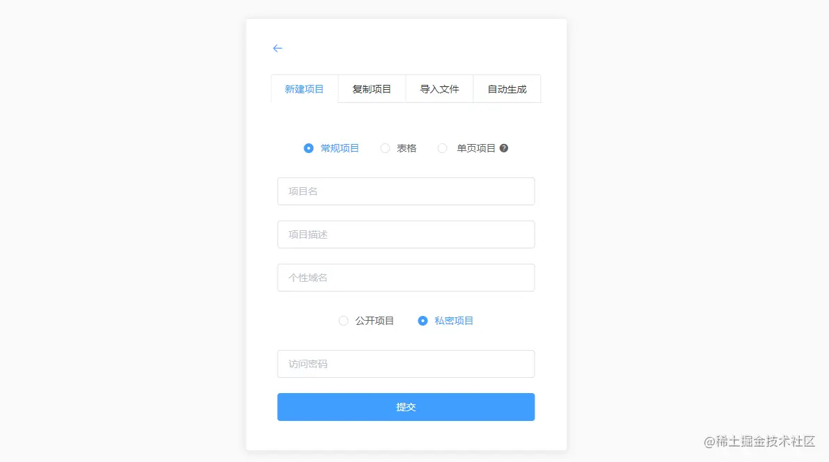 ShowDoc新建项目可选常规的API文档、在线表格、或者单页文档(不支持目录分层),允许对项目文档设置访问密码,自定义域名,这里并不是真正意义上的“域名”,只是在文档服务域名后加了一级目录,例如: