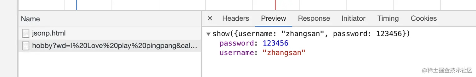 - 服务器接收到请求后,需要进行特殊的处理:把传递进来的函数名和它需要给你的数据拼接成一个字符串,例如:传递进去的函数名是show,它准备好的数据是 show('我喜欢乒乓球')。