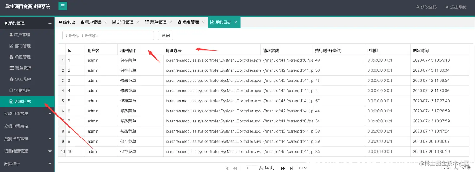 管理后主要功能模块:用户管理、角色管理、承菜管理、权限管理、竞赛报名管理、经费申请和审核管理、项目结题管理、立项申请管理等具体功能