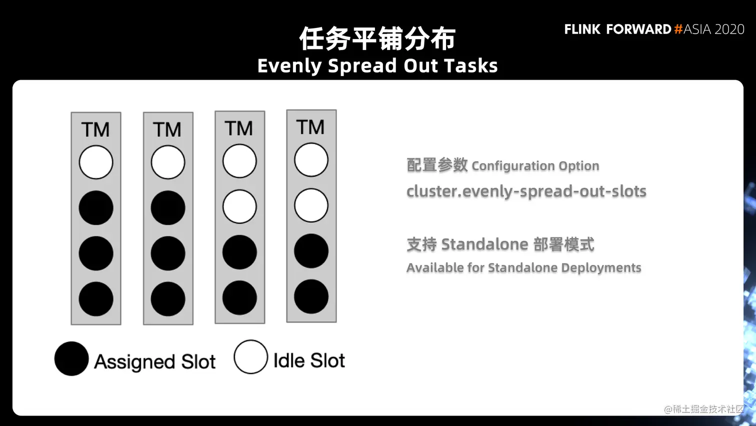 - 第一,这个参数我们只针对 Standalone 模式,因为在 yarn 跟 k8s 的模式下,实际上是根据你作业的需求来决定起多少 task manager 的,所以是先有了需求再有 TaskManager,而不是先有 task manager,再有 slot 的调度需求。在每次调度任务的时候,实际上只能看到当前注册上来的那一个 TaskManager,Flink 没办法全局的知道后面还有多少 TaskManager 会注册上来,这也是很多人在问的一个问题,就是为什么特性打开了之后好像并没有起到一个很好的效果,这是第一件事情。
