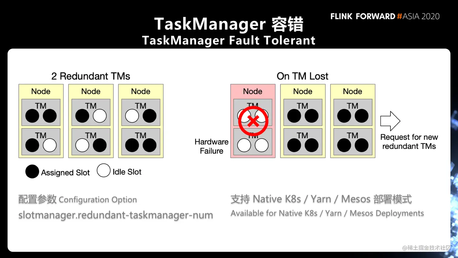 通过配置 slotmanager.redundant-taskmanager-num 可以实现冗余 TaskManager。这里所谓的冗余 TaskManager 并不是完完全全有两个 TaskManager 是空负载运行的,而是说相比于我所需要的总共的资源数量,会多出两个 TaskManager。
