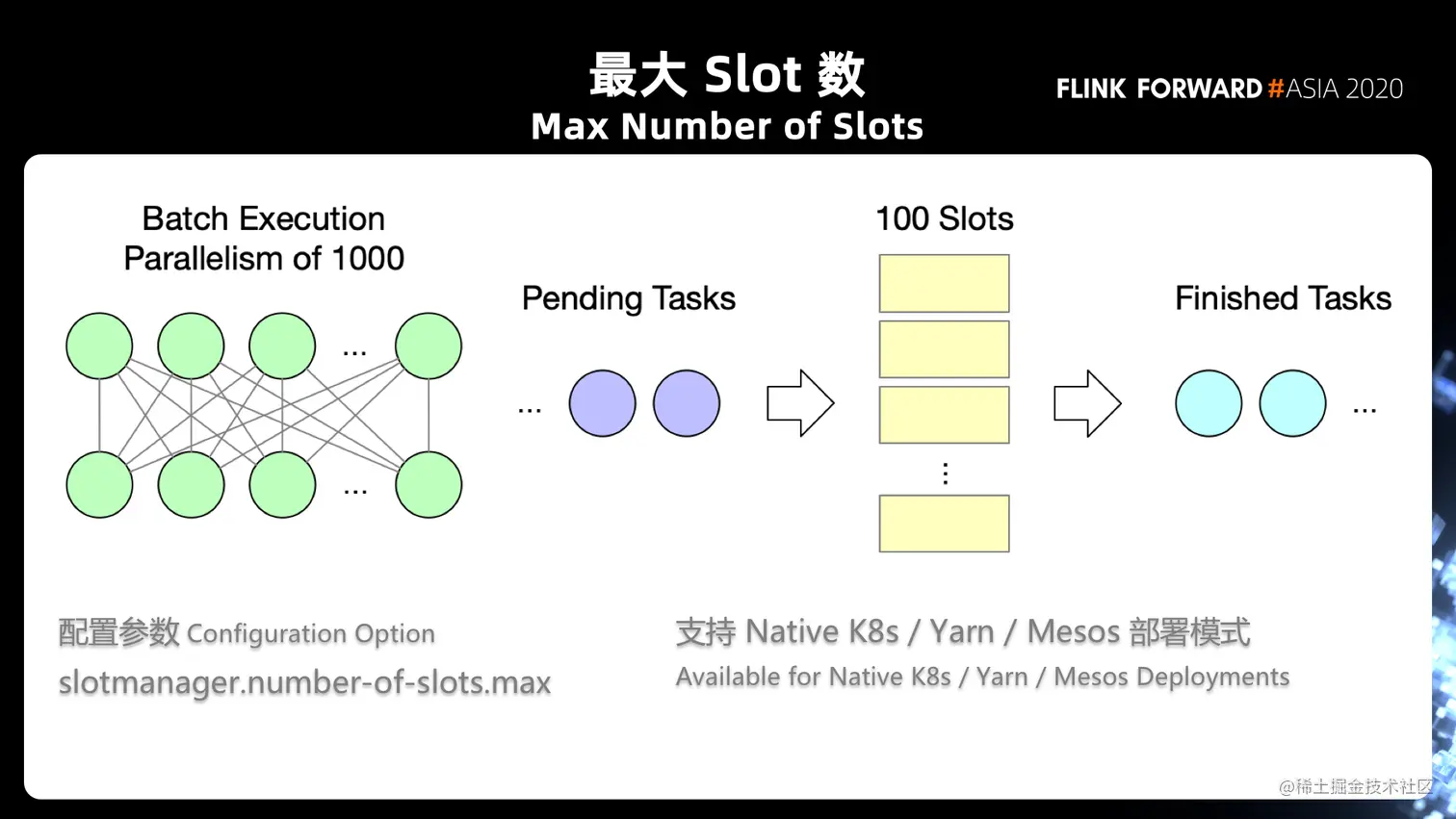 然而对于批处理其实并不是这样的,批处理作业往往可以有一个很大的并发度,但实际并不需要这么多的资源,批处理用很少的资源,跑完前面的任务腾出 Slot 给后续的任务使用。通过这种串行的方式去执行任务能避免 YARN/K8s 集群的资源过多的占用。目前这个参数支持在 yarn/mesos/native k8 使用。
