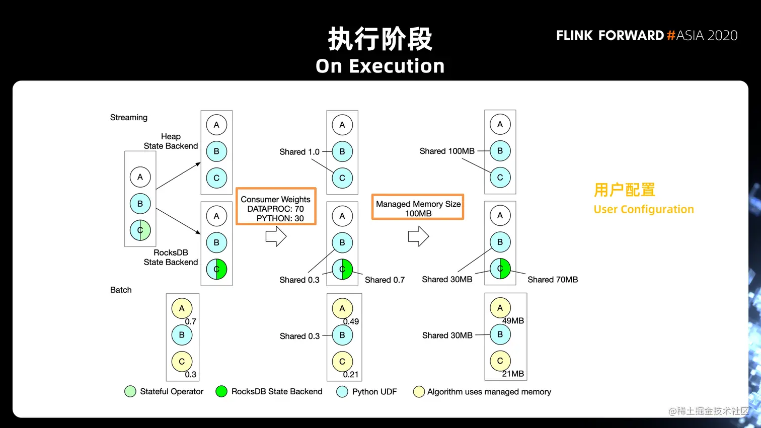 批处理的情况跟流的情况有两个不同的地方,首先它不需要去判断 State Backend 的类型,这是一个简化; 其次对于 batch 的算子,上文提到每一个算子有自己独享的资源的预算,这种情况下我们会去根据使用率算出不同的使用场景需要多少的 Shared 之后,还要把比例进一步的细分到每个 Operator。
