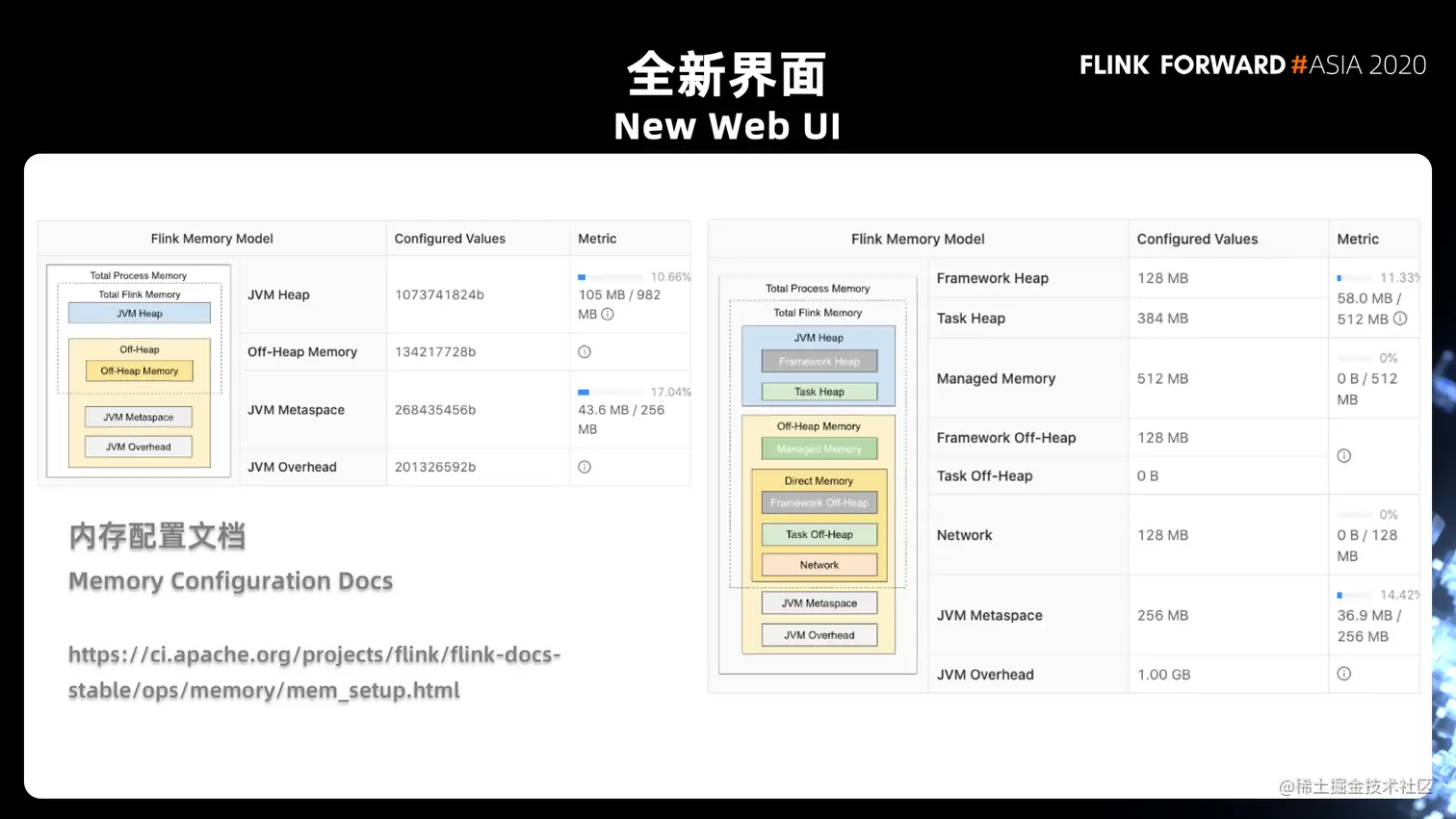 在新的 Web UI 中,可以直接将每一项监控指标配置值、实际使用情况对应到内存模型中进行直观的展示。在此基础上,可以更清楚的了解到作业的运行情况、该如何调整、用哪些配置参数调整等 (社区也有相应的文档提供支持)。通过新的 Web UI,大家能更好的了解作业的使用情况,内存管理也更方便。