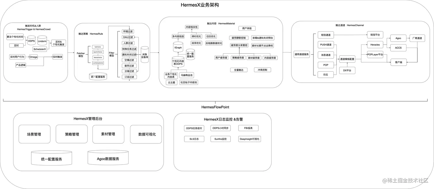 在触达通道侧我们对不同的通道进行了协议的抽象,可以根据配置信息灵活调度。 最后送上HermesX的架构大图,有兴趣的朋友们可以和我进行深入交流: