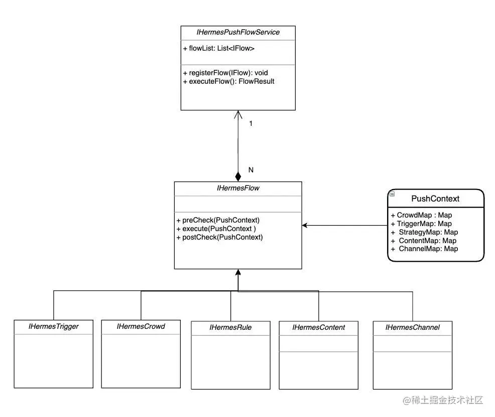 可以把串联五个要素的服务抽象为HermesXFlowService,每个要素作为一个HermesXFlowPoint的实例,HermesXFlowPoint明确知道执行逻辑的先决条件,具体执行逻辑以及执行后的检查工作。