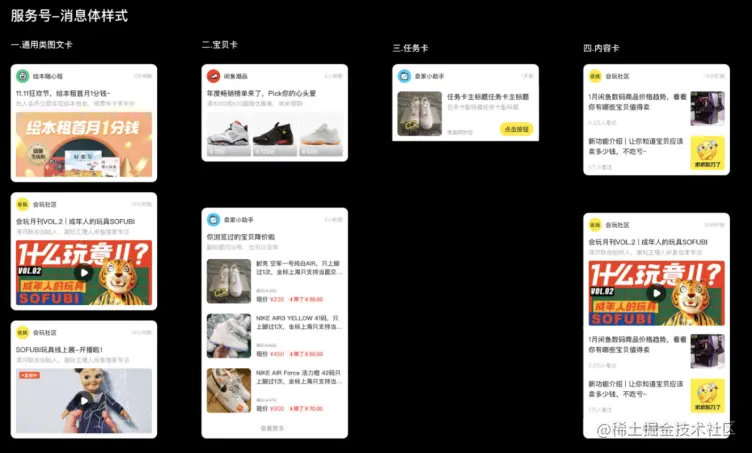 同时,为了丰富端上信息展示的样式,我们跟随服务号一期项目,同时新开发了多种消息卡片样式,这些卡片支持DX卡片动态下发内容,不需要跟版本发布,提升了需求迭代的效率,提升了用户获取内容的效率和体验。