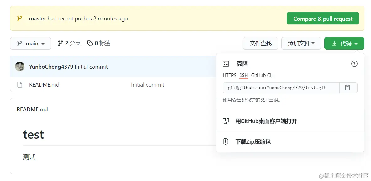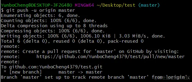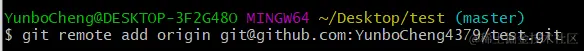 此时这里的输入的命令是 :git remote add origin git@github.com:YunboCheng4379/test.git