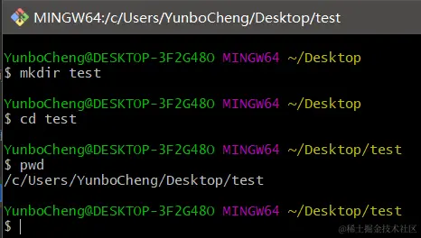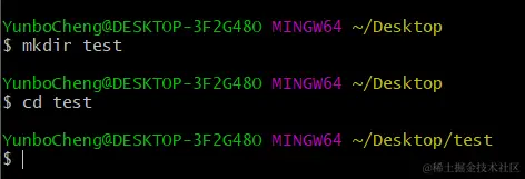 现在我通过命令行新建一个test文件夹(你也可以在其他的任何地方创建这个文件夹 注意:在哪个文件夹中打开git-bash.exe命令,就在该文件夹下创建一个新的版本库),并且进入该文件夹下。