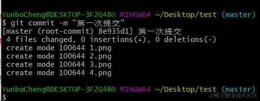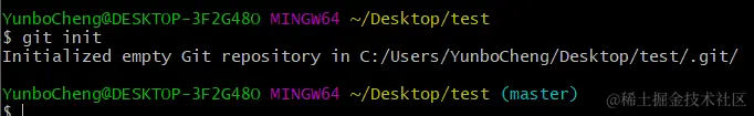 在路径的最后边出现了带括号的master (master)说明此时将test的这个版本库提交到了git的主分支master上.