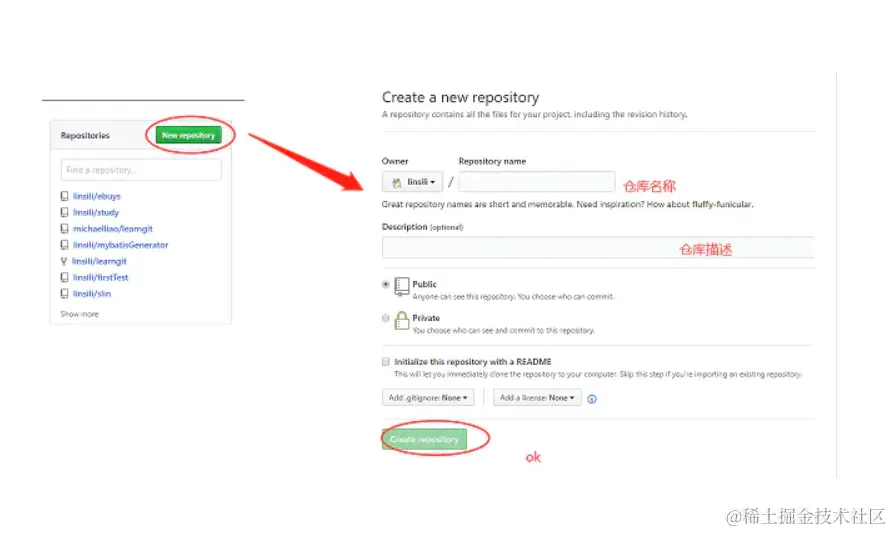 注意有坑: 在上面第5步新建远程仓库的时候如果你勾选了Initialize this repository with a README(就是创建仓库的时候自动给你创建一个README文件),那么到了第7步你将本地仓库内容推送到远程仓库的时候就会报一个 failed to push some refs to github.com/guyibang/TE… 的错。