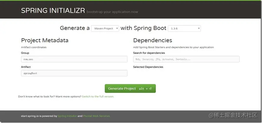 2、选择构建工具Maven Project、Spring Boot版本1.3.6以及一些工程基本信息,点击“Switch to the full version.”java版本选择1.7,可参考下图所示: