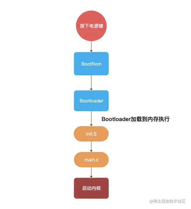 - 手机按下电源键后,引导芯片在bootrom获取到引导程序,把引导程序加载到内存执行。