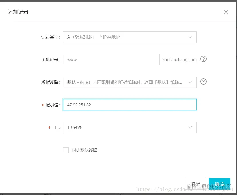 记录类型选A,主机记录让你写自己的二级域名或三级域名,解析线路选择默认,记录值为你要绑定的ip,TTL就选10分钟