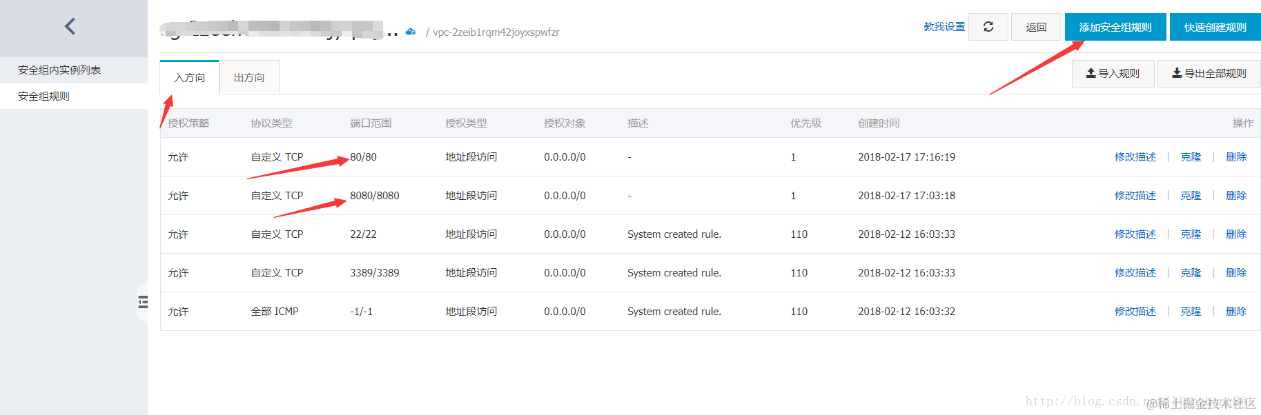 进入阿里云管理控制台->云服务器ECS->网络和安全->安全组,这时会显示你的服务器列表,在你要修改的服务器右下角点击“配置规则”,显示出规则列表,
