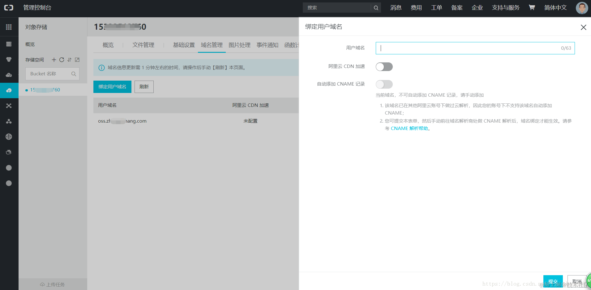 然后回到oss控制台在域名管理点击绑定用户域名,然后输入刚才生成的三级域名即可。