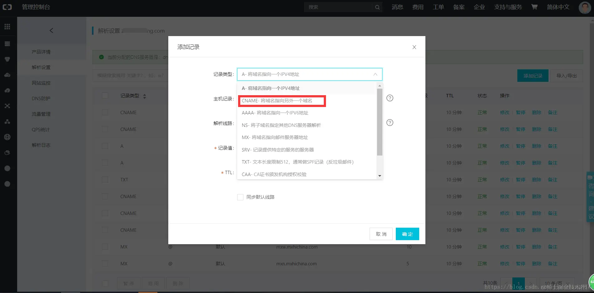 可以看到CNAME类型为将此域名指向另一个域名,我要做的就是把我的域名指向oss域名,所以选择CNAME,