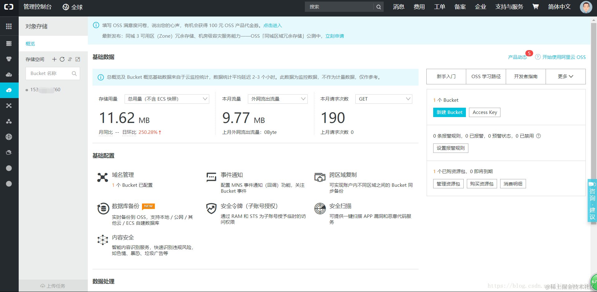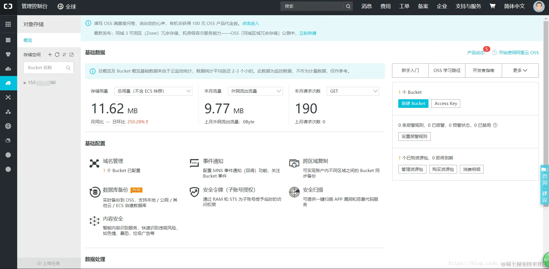 我买的是3年存储包,所以存储容量费用已交,但外网访问资源产生的流量费用和请求次数需要额外缴费,内网访问资源也就是从阿里云服务器ecs中访问倒是流量免费。