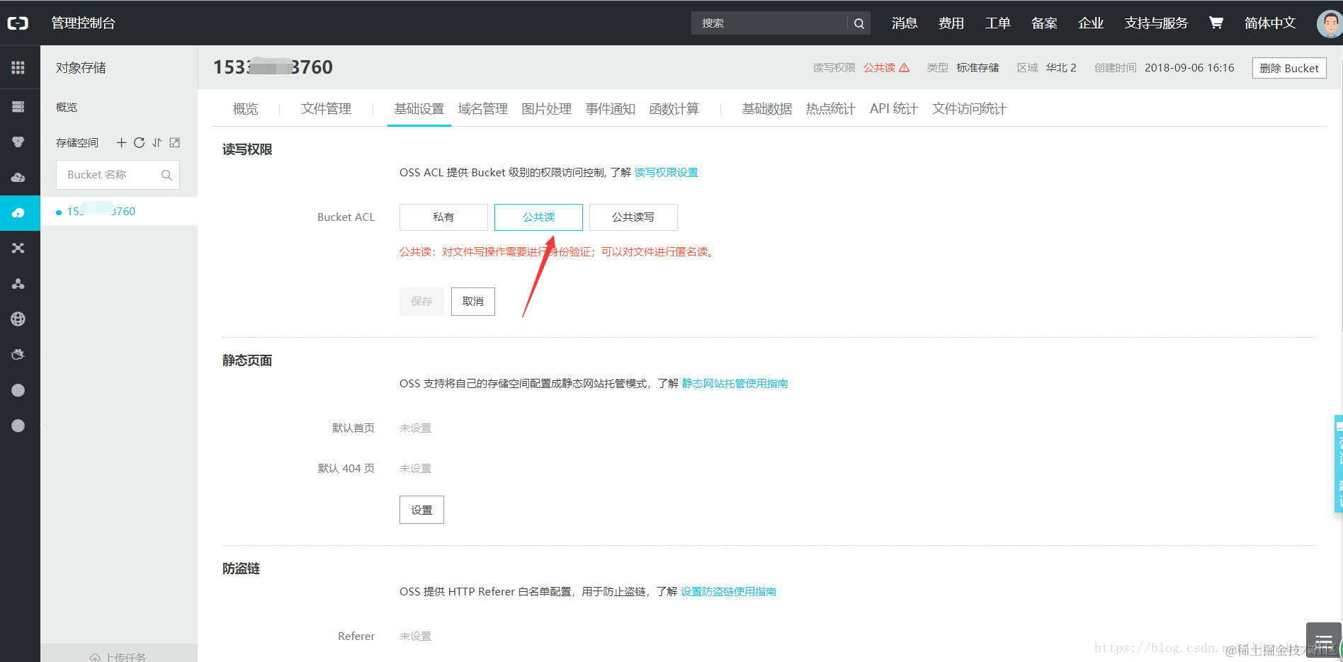 点击新建的bucket,在基础设置里设置一下读写权限,因为我做的是展示型网站,所以我设置了公共可读