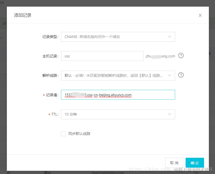 我为我的域名添加三级域名oss,并指向记录值为oss的域名,点击确定,完成三级域名的创建。