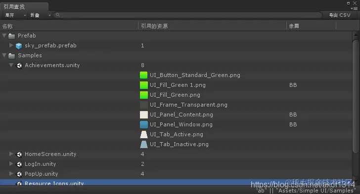 在游戏制作过程,随着资源越来越多,可能存在重复的资源,也需要删除不被使用的资源,但是如果使用 Unity 的 API 去查找引用关系将会很耗时间,另外,资源都是对应使用的,比如 UI 图片只在 UI 界面上进行引用,所以不需要去查找其他地方是否引用到。
