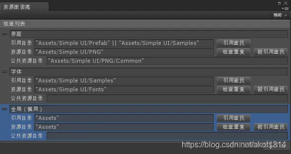 ② 【引用查找】功能,是对【引用目录】下的每个资源进行检查是否引用到了【资源目录】下的资源,比如 UI 界面预制引用 UI 图片