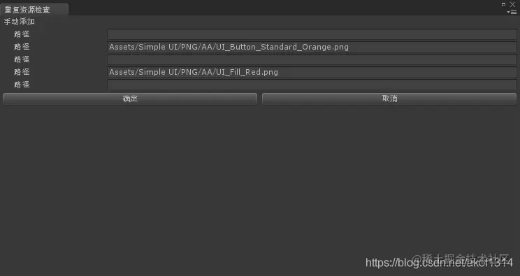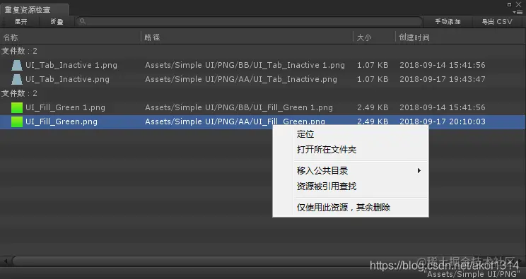 当美术对同一资源进行切图两次,会导致文件 MD5 值不一样,就无法被工具所检测到。出现这种情况的时候,肉眼发现到两个资源其实是一样的,可以在这个窗口右上角点击【手动添加】按钮