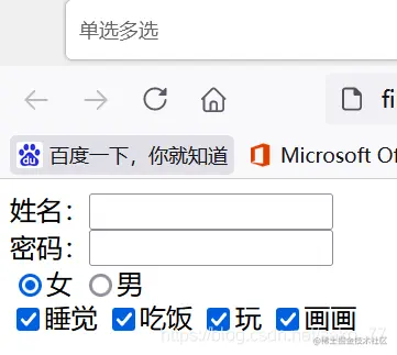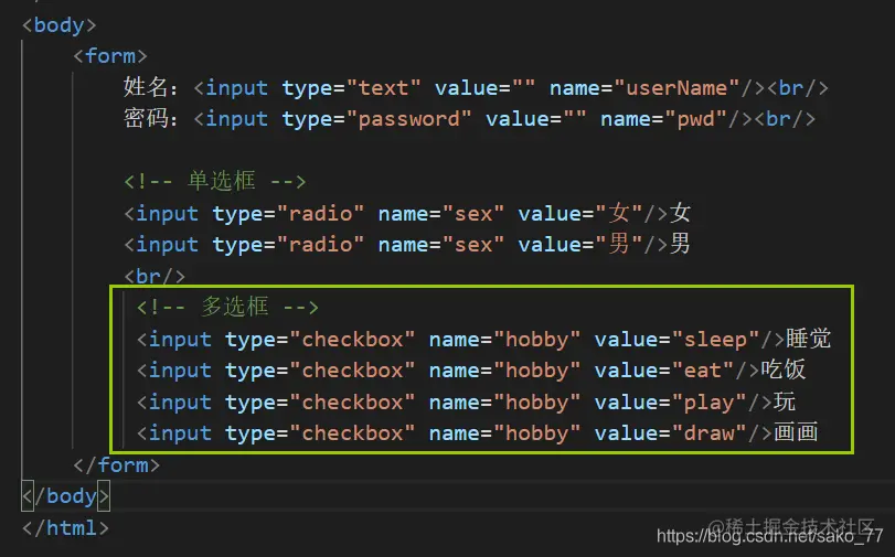 checkbox多选框,一般由□表示,name一般写成同一组。(数组形式获取)