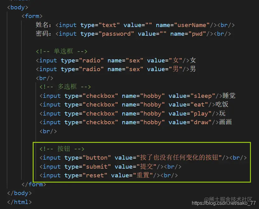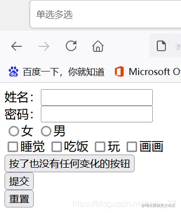 type的值有text、password、checkbox(多选)、radio(单选)、submit()、reset(清空表单)、file、hidden、image和button,默认值是text。